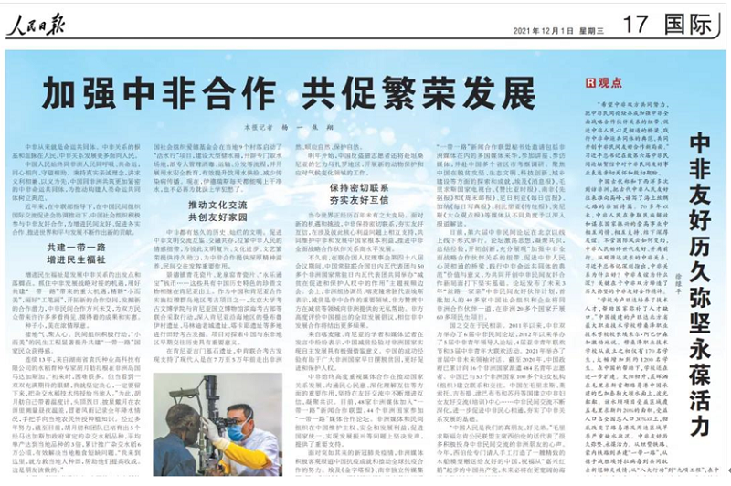 今年是中非开启外交关系65周年。65年来,中非双方结下了牢不可破的兄弟情谊。在刚刚结束的中非合作论坛第八届部长级会议上,习近平主席提出推动中非关系发展的4点主张和加强中非务实合作的“九项工程”,再次彰显了中方对帮助非洲抗击疫情和实现绿色可持续发展的真诚意愿和坚定支持。