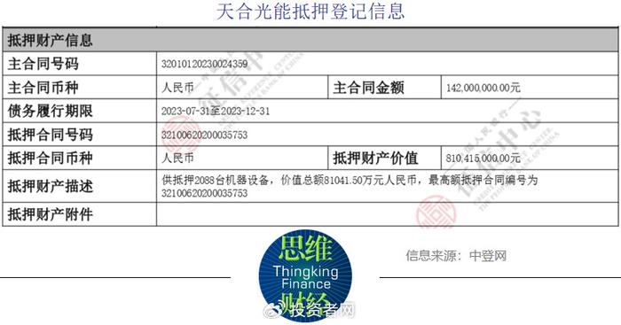 中登网显示,天合光能有多笔抵押登记信息。其中一条登记信息是在7月31日,天合光能向中国农业银行抵押了2088台机器设备,价值总额约8.10亿,债务履行期限是2023年7月31日至12月31日。