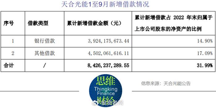 不仅如此,天合光能还通过对外借款募集资金。公告显示,2023年1至9月公司及合并报表范围内下属子公司累计新增借款金额为84.26亿元,占2022年末归属于上市公司股东的净资产的31.99%。