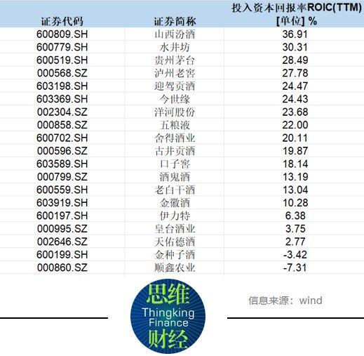 投入资本回报率(ROIC)代表着一家公司利用资源产生效益的高低,这是判断一家公司盈利能力强弱的重要指标之一。A股上市酒企中,有10家企业的ROIC超过20%,分别是山西汾酒、水井坊、贵州茅台、泸州老窖、迎驾贡酒、今世缘、洋河股份、五粮液、舍得酒业。