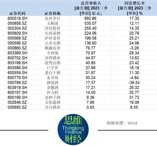 具体来看,有7家酒企在2023年前三季度营收超过百亿元以上,其中贵州茅台、五粮液、洋河股份营收分别达到892.86亿元、535.07 亿元与255.40亿元;山西汾酒、泸州老窖、古井贡酒也在百亿俱乐部,顺鑫农业、今世缘与舍得酒业紧随其后。