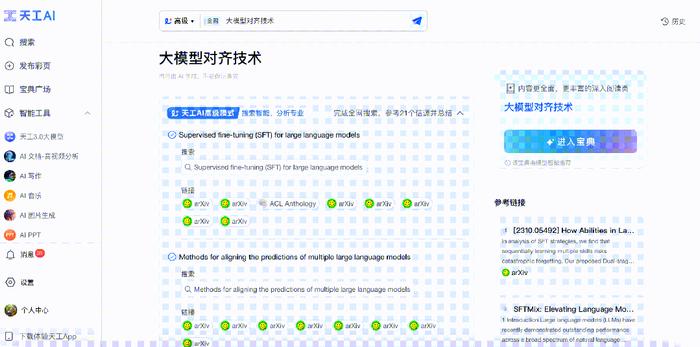 搜索“大模型对齐技术”,映入眼帘的是十多篇来自arXiv的论文,天工AI不仅帮用户直接分析了这些论文,还将PDF原文一一对应到相应的论点中去,用户能直接溯源点击查看原论文。不仅在信源的质和量上有升级,天工AI对科研学术领域的问题拆解和分析,也做到了有广度、有深度。