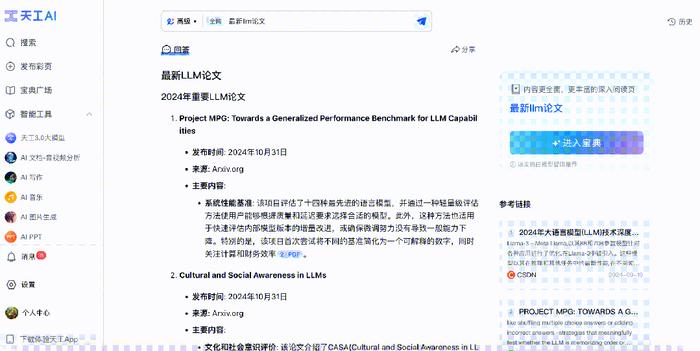 我们只需要向天工AI提问“最新LLM论文”,它就可以开始依次检索2024年、2023年的最新相关论文,并将每篇论文的发布时间、来源、核心内容等提炼出来。