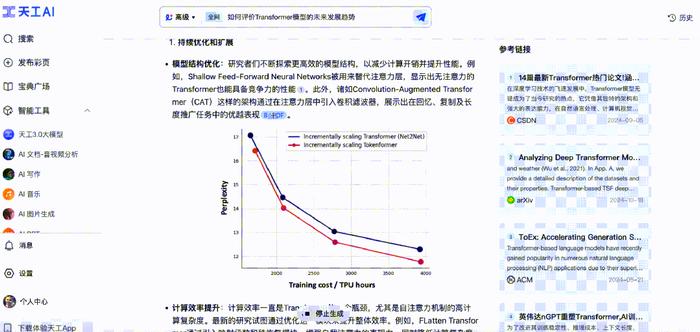 让天工AI“评价Transformer模型的未来发展趋势”,它不仅分析了几十篇中英文论文,还将图片和技术术语进行详解,从技术细节、最新进展、应用现状分析了专业AI领域的问题。