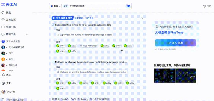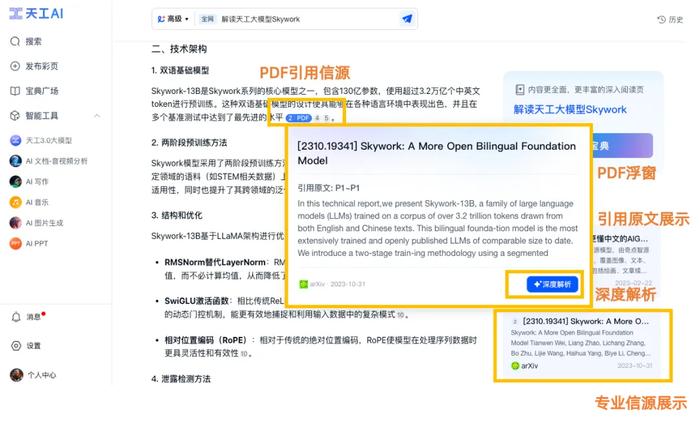 但是在天工AI中,我们尽管只输入一句搜索关键词“详细解读天工大模型”,天工AI则会自动扩展它的定义、背景、技术架构、案例等,一次性为用户展示出来,并在每个问题拆解中都涵盖arXiv等权威信源。