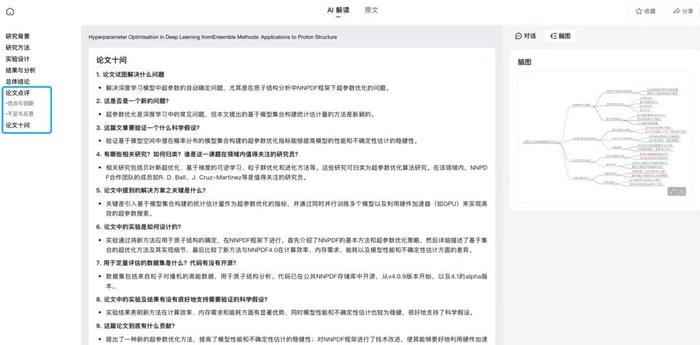 同时,还可以提供论文点评、论文十问、脑图功能(如下图所示),来帮助阅读者更好的解析论文。