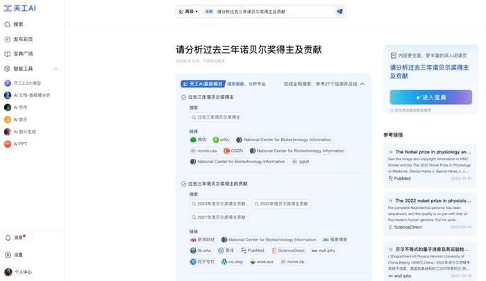 我们可以看到,AI先自己查询了过去三年诺贝尔奖得主,然后再查询每位获奖者的详细贡献,并且给出了足够丰富、权威、可追溯的信源,在右侧参考链接栏,可以直接点击追溯原论文或信息源。