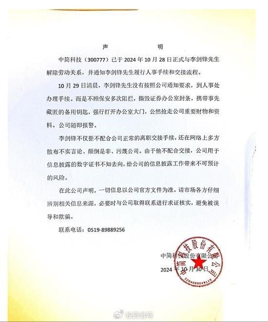 近日,网络流传出一份中简科技解聘董秘李剑锋的声明,称公司已与李剑锋解除劳动关系,但10月29日凌晨,李剑锋先生没有按照公司通知要求,到人事处办理手续。而是不顾保安多次阻拦,撕毁证券办公室封条,携带事先藏匿的备用钥匙,强行打开办公室大门,公然抢走公司重要财物和资料。公司随即报警。并称公司用于信披的数字证书不知去向,落款日期为10月30日。据媒体报道,发表声明的中简科技综合管理部表示,李剑锋确实已被解聘。