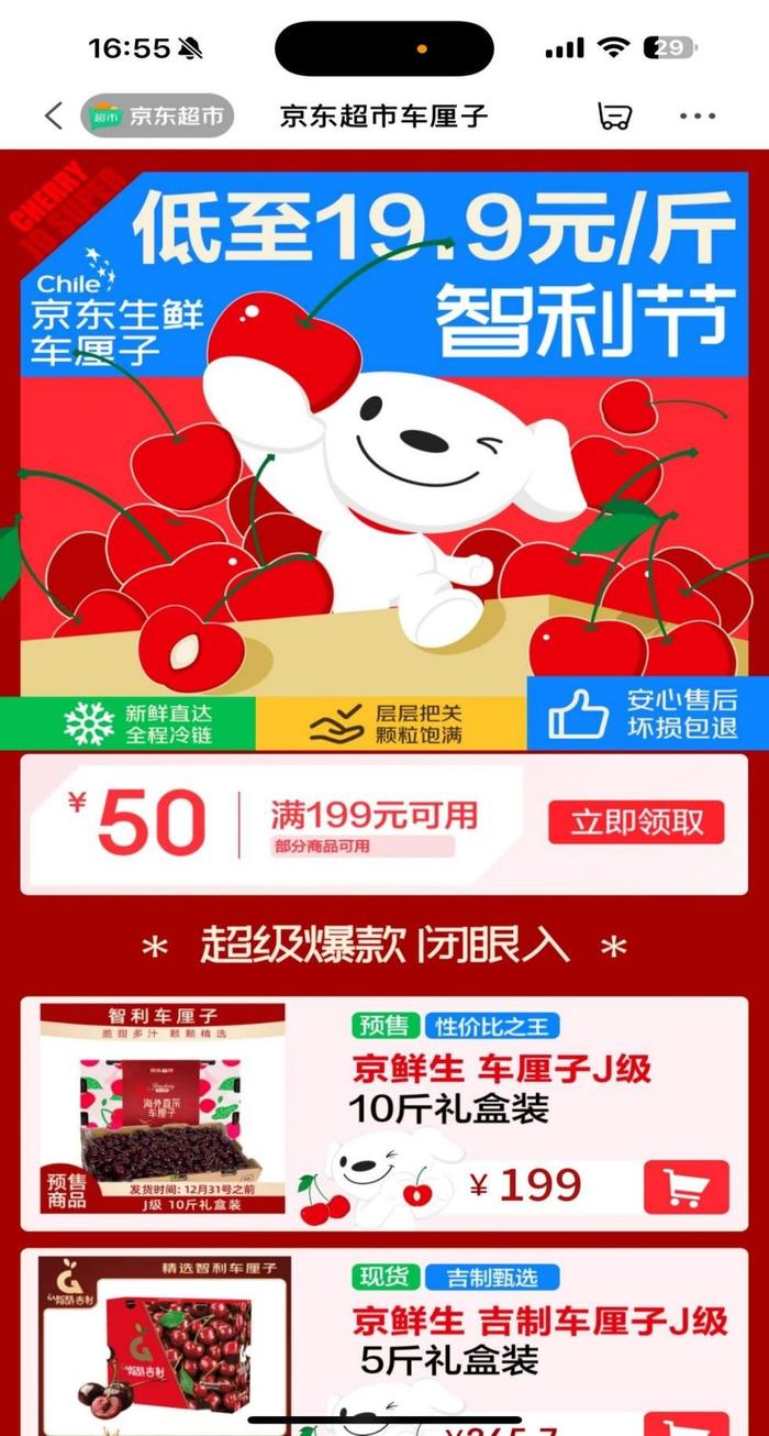 大规模集中采购降低了智利车厘子价格,同时,相较于其他平台,通过源头直采、百亿农补等方式,同等级、规格的智利车厘子,京东超市所售卖的整体要便宜15%。