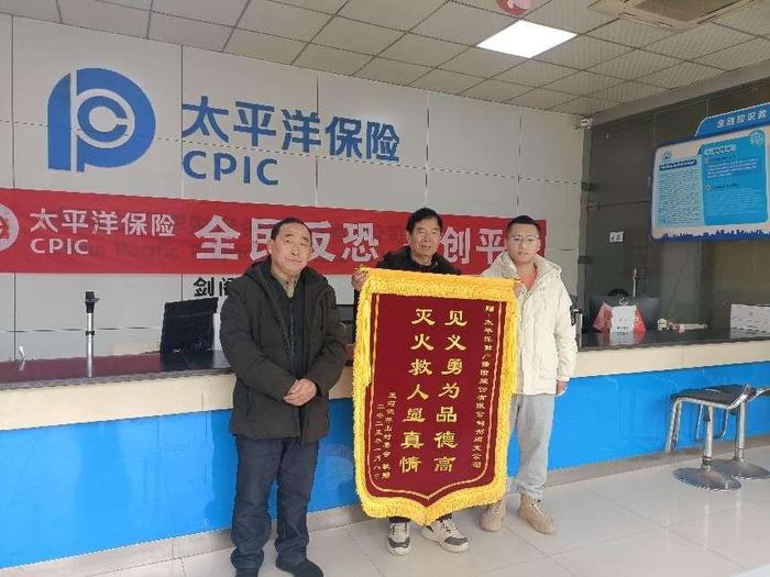 1月14日,四川剑阁县王河镇林山村委书记带着一面写有“灭火救人显真情 见义勇为品德高”的锦旗,来到中国太保产险剑阁支公司,对该公司农险协保员高伟和雷永兵的英勇行为表达深深的谢意。