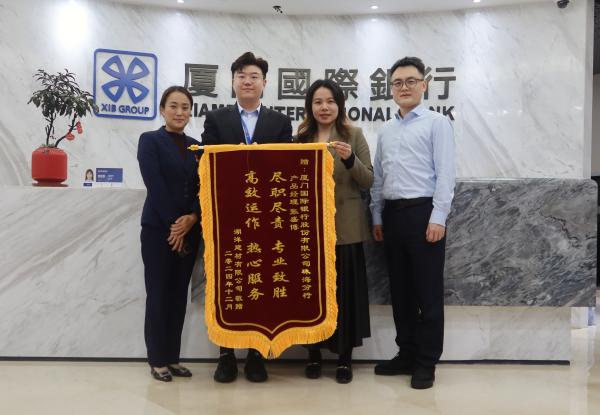 近日,厦门国际银行珠海分行收到由某国企供应商H建材有限公司送来的一面“尽职尽责 专业致胜 高效运作 热心服务”的锦旗。这不仅是对厦门国际银行珠海分行积极践行数字金融的认可,也是银企合作共赢的有力见证。
