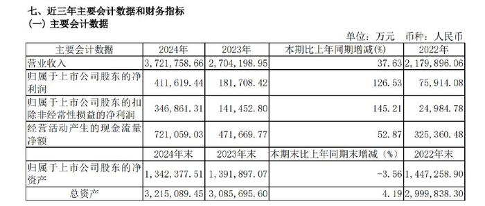 年报显示,宇通客车2024全年累计销售客车4.69万辆,同比提升28.48%;营业收入372.18亿元,同比提升37.63%;净利润41.16亿元,同比提升126.53%。