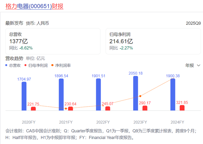 然而,全行业稳步增长的背景下,2025年三季报显示,格力电器营业总收入1376.54亿元,同比下降6.62%;归母净利润214.61亿元,同比下降2.27%。
