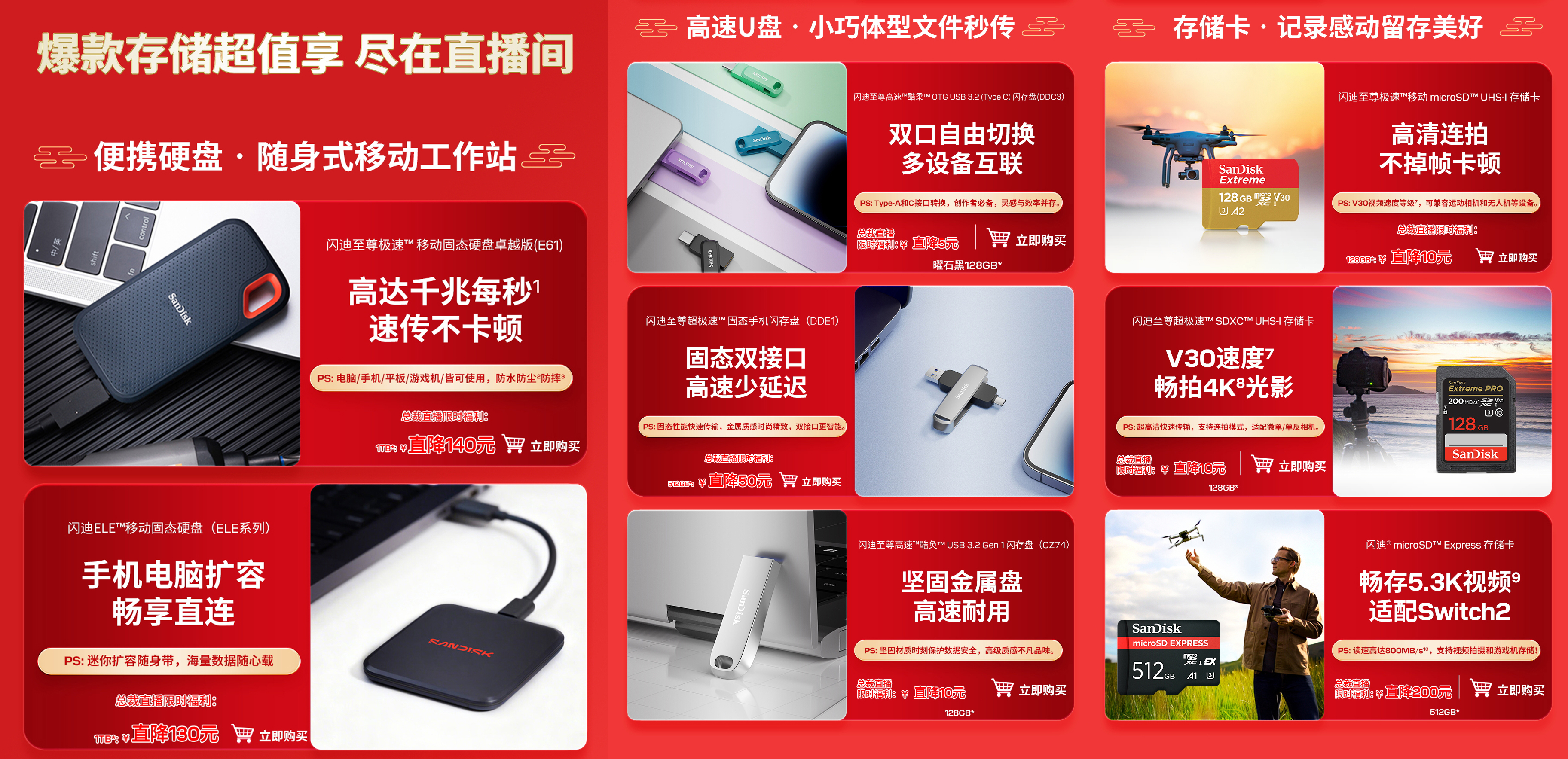 值得一提的是,除了直播间独家福利,活动会场还同步开启全站促销,众多经典爆品迎来年度好价。从行车记录仪到专业相机,各类型号存储卡均有优惠,例如闪迪128GB 4K高清影像存储卡等,好评率高达99%,是扩容备份、提升设备性能的性能优选;闪迪256GB TF内存卡,适配行车记录仪、无人机、监控等装备,以优异性能和高适配性带来畅快存储体验。
