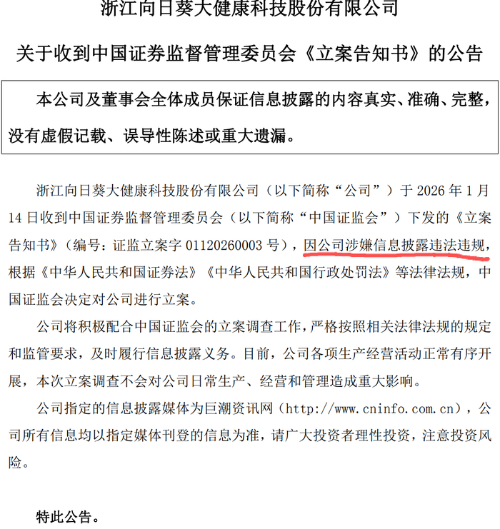 2026年1月14日,证监会正式给向日葵下发了《立案告知书》,定性公司涉嫌“误导性陈述”。这意味着,这场试图用“空壳工厂”包装成半导体新贵的资本大戏,在监管的穿透式执法下宣告终结。