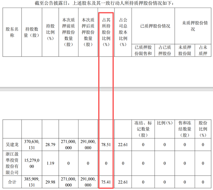 除了减持外,吴建龙还通过高比例质押其持有的向日葵股权,以获得现金流。数据显示,在吴建龙2023年增持后,吴建龙及其一致行动人的股权质押比例迅速攀升。截止2025年9月,吴建龙所持有的向日葵57.27%的股权已处于质押状态,最高时,其估值质押比例甚至超过了75%。