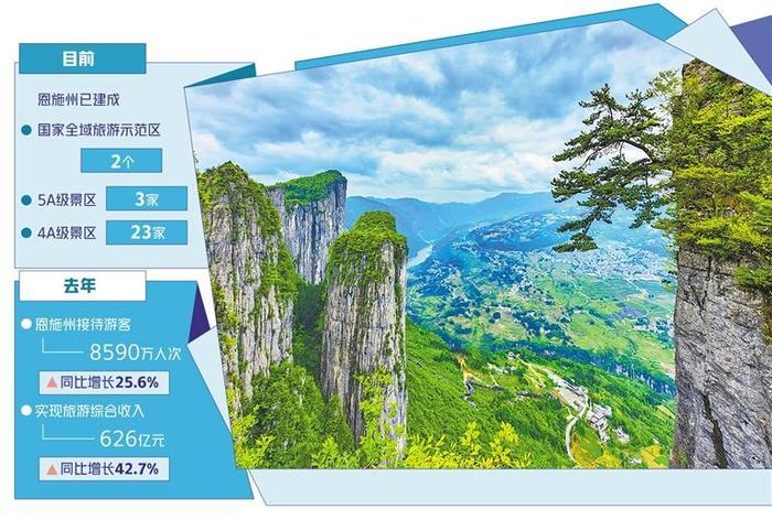 绿水青山是恩施最鲜明的底色。近年来,恩施州坚持生态优先,践行“两山”理念,充分发挥“土、硒、茶、凉、绿”等特色资源优势,积极建设世界级旅游目的地,旅游业发展持续火热。目前,已建成2个国家全域旅游示范区、3家5A级景区和23家4A级景区。