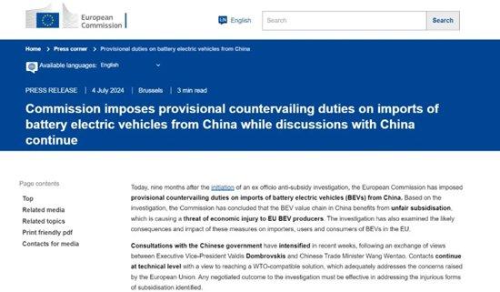 中国经济网北京7月5日讯(记者 郭涛)当地时间7月4日,欧盟委员会发布公告称,在对中国电动汽车(BEV)进行为期九个月的反补贴调查后,决定对来自中国的电动汽车进口征收临时反补贴税。