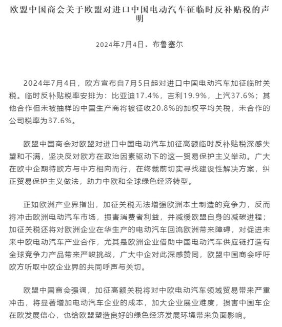 对于欧盟作出的加征高额临时反补贴税的决定,欧盟中国商会7月4日发表声明称,坚决反对欧方在政治因素驱动下的这一贸易保护主义举动。加征高额关税将对中欧电动汽车领域贸易带来严重冲击,将显著增加电动汽车企业的成本,加大企业展业难度,损害中国车企在欧发展信心,也给欧盟塑造良好的绿色经济发展环境带来负面影响。