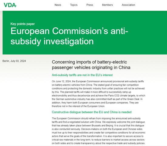 就在欧盟此次公告发布的前一天(7月3日),德国汽车工业协会再度发表声明称,反对欧盟对从中国进口的电动汽车征收临时反补贴关税,并认为此举不符合欧盟利益,不仅会对欧洲消费者和企业造成负面影响,还将阻碍欧盟本土电动汽车市场发展,也不利于实现气候目标。