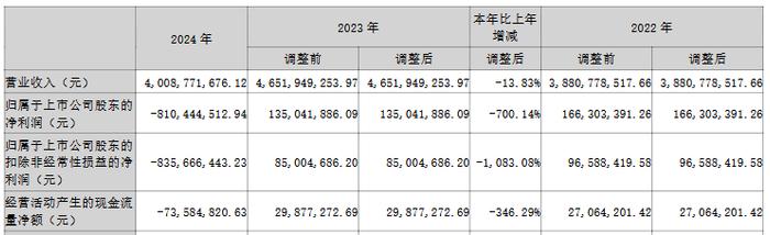 2024年,公司实现营业收入40.09亿元,同比下降13.83%;归属于上市公司股东的净利润为-8.10亿元,上年同期为1.35亿元;归属于上市公司股东的扣除非经常性损益的净利润为-8.36亿元,上年同期为8,500.47万元;经营活动产生的现金流量净额为-7,358.48万元,上年同期为2,987.73万元。