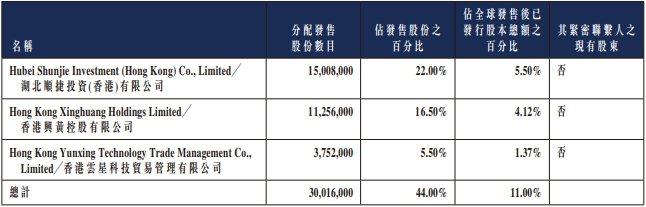 最终发售价及配发结果公告显示,香江电器的基石投资者为湖北顺捷投资(香港)有限公司、香港兴黄控股有限公司和香港云星科技贸易管理有限公司,分配发售股份数目分别为15,008,000股、11,256,000股和3,752,000股,占发售股份之百分比分别为22.00%、16.50%和5.50%。