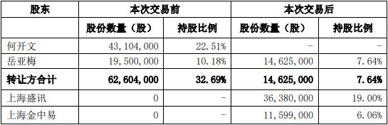 何开文将其持有的公司36,380,000股无限售流通股(占公司总股本的19.00%)转让给上海盛讯。何开文、岳亚梅将合计持有的公司11,599,000股无限售流通股(占公司总股本的6.06%)转让给上海金中易,其中何开文转让6,724,000股无限售流通股(占公司总股本的3.51%),岳亚梅转让4,875,000股无限售流通股(占公司总股本的2.55%)。