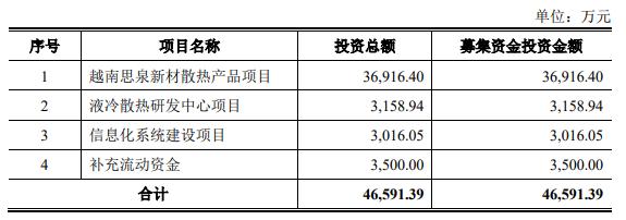 思泉新材昨晚发布2025年度向特定对象发行股票预案。本次向特定对象发行股票拟募集资金总额不超过46,591.39万元(含本数),扣除发行费用后的募集资金将用于越南思泉新材散热产品项目、液冷散热研发中心项目、信息化系统建设项目、补充流动资金。