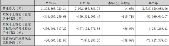 据公司2024年年报,报告期内,公司实现营业收入33.96亿元,同比增长14.63%;归属于上市公司股东的净利润-3.44亿元,2023年为-1.59亿元;扣除非经常性损益后的净利润-3.67亿元,2023年为-1.97亿元;经营活动产生的现金流量净额-2666.56万元。