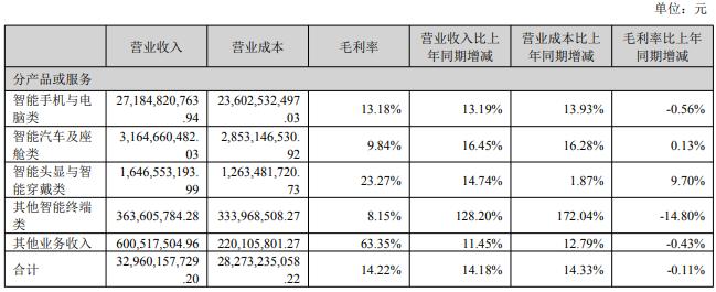 上半年蓝思科技毛利率为14.22%,同比下降0.11个百分点。