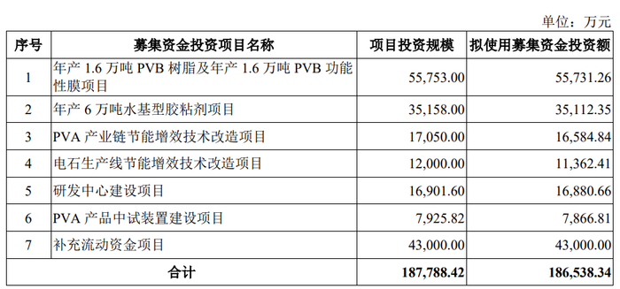 招股书显示,双欣环保本次拟募集资金186,538.34万元,用于年产1.6万吨PVB树脂及年产1.6万吨PVB功能性膜项目、年产6万吨水基型胶粘剂项目、PVA产业链节能增效技术改造项目、电石生产线节能增效技术改造项目、研发中心建设项目、PVA产品中试装置建设项目、补充流动资金项目。