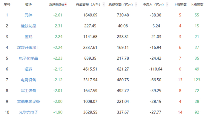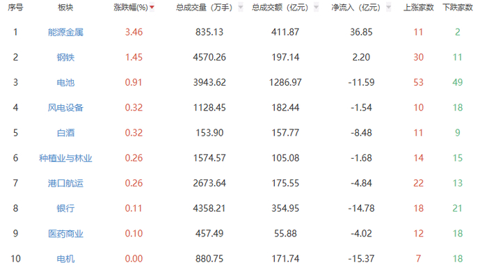 板块方面,能源金属、钢铁、电池等板块涨幅居前,元件、橡胶制品、游戏等板块跌幅居前。
