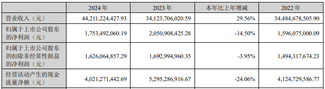 2024年,领益智造实现营业收入442.11亿元,同比增长29.56%;归属于上市公司股东的净利润17.53亿元,同比下降14.50%;归属于上市公司股东的扣除非经常性损益的净利润16.26亿元,同比下降3.95%;经营活动产生的现金流量净额40.21亿元,同比下降24.06%。