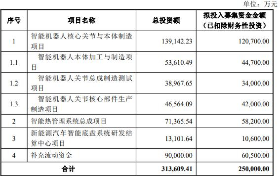 本次拟发行可转换公司债券的募集资金总额不超过人民币250,000.00万元(含本数),扣除发行费用后将全部用于智能机器人核心关节与本体制造项目、智能热管理系统总成项目、新能源汽车智能底盘系统研发结算中心项目、补充流动资金。