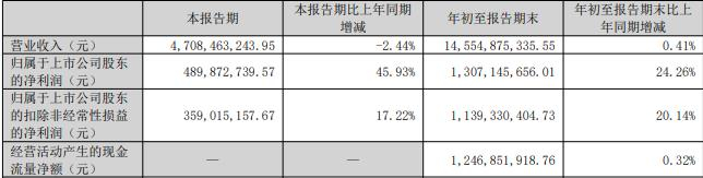 年初至报告期末,公司实现营业收入145.55亿元,同比增长0.41%;归属于上市公司股东的净利润13.07亿元,同比增长24.26%;扣除非经常性损益后的净利润11.39亿元,同比增长20.14%,经营活动产生的现金流量净额12.47亿元,同比增长0.32%。