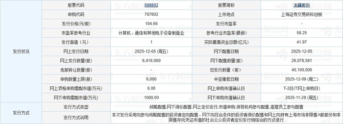 沐曦股份于2025年12月4日发布的首次公开发行股票并在科创板上市发行公告显示,按本次发行价格104.66元/股和4,010.0000万股的新股发行数量计算,若本次发行成功,预计该公司募集资金总额为419,686.60万元,扣除29,755.50万元(不含增值税)的发行费用后,预计募集资金净额为389,931.10万元(如有尾数差异,为四舍五入所致)。