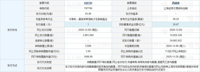 昂瑞微于2025年12月4日发布的首次公开发行股票并在科创板上市发行公告显示,按本次发行价格83.06元/股和2,488.2922万股的新股发行数量计算,若本次发行成功,预计昂瑞微募集资金总额206,677.55万元,扣除约13,445.28万元(不含增值税)的发行费用后,预计募集资金净额193,232.27万元(如有尾数差异,为四舍五入所致)。