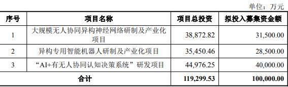 公司本次向特定对象发行股票募集资金总额不超过100,000.00万元(含本数),在扣除发行费用后的净额拟用于大规模无人协同异构神经网络研制及产业化项目、异构专用智能机器人研制及产业化项目、“AI+有无人协同认知决策系统”研发项目。