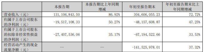 据公司2025年第三季度报告,2025年前三季度,公司营业收入3.05亿元,同比增长72.72%;归属于上市公司股东的净利润-4815.76万元,上年同期为-9129.53万元;归属于上市公司股东的扣除非经常性损益的净利润-6719.45万元,上年同期为-1.01亿元;经营活动产生的现金流量净额-1.42亿元,上年同期为-2.26亿元。