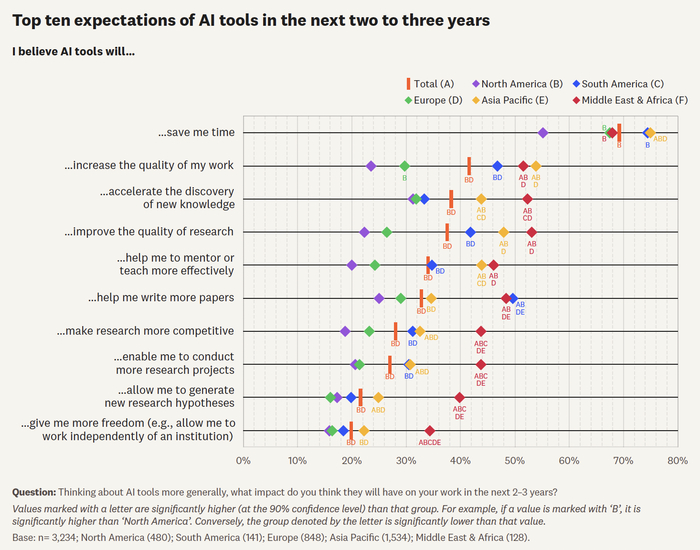 科研人员对AI工具的信心呈现明显地域差异,尤其在中国、美国和英国之间差异突出。对于 AI 在科研流程的价值,中国科研人员展现出远高于欧美的信心。68%的受访中国科研人员认为AI工具让他们拥有更多选择,而在美国和英国,这一比例仅为29%和26%。当被问及AI是否能赋能科研时,64%的中国研究者表示认同,而美国和英国的比例仅为25%和24%。在提升科研效能方面,中国科研人员的积极程度也显著领先,例如 79% 的中国受访者认为 AI 能有效节省科研时间(美国为54%,英国为57%),60% 认为 AI 有助于提升研究质量(美国22%,英国17%),49% 认为 AI 能加速科研发现(美国30%,英国26%)。
