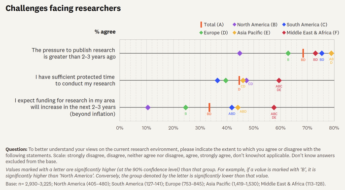 报告显示,只有45%的科研人员认为自己拥有足够的时间用于科研,且仅有33%预期未来两到三年内本领域科研经费会增加,其中北美和欧洲科研人员的悲观情绪尤为突出;此外,68%的受访者认为发表压力明显高于两三年前。尽管如此,科研人员依然坚定维护科研质量与科研诚信,74%的受访者认为经过同行评审的科研值得信赖,并视同行评审为保障科研诚信、扩大影响力的重要机制。
