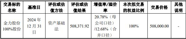 根据中联评估以2024年12月31日为评估基准日出具的《资产评估报告》,截至评估基准日,标的公司股东全部权益价值的评估值为508,371.92万元,较母公司口径账面价值420,892.47万元增值87,479.45万元,母公司口径账面所有者权益评估增值率为20.78%,合并口径(归属于母公司)账面所有者权益评估增值率为12.68%。交易各方根据上述评估结果经友好协商后确认,在本次交易中标的资产的交易作价为人民币508,000.00万元。其中,40,000万元以现金对价的方式支付,468,000万元以发行股份的方式支付。