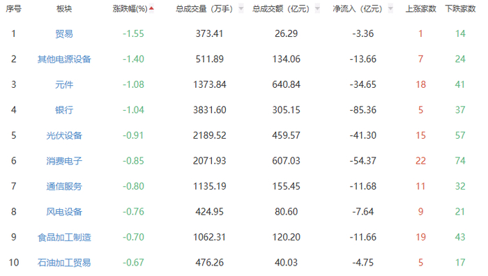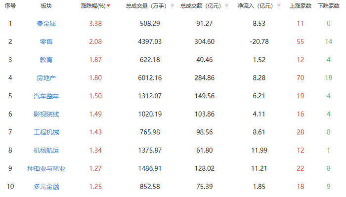板块方面,贵金属、零售、教育等板块涨幅居前,贸易、其他电源设备、元件等板块跌幅居前。