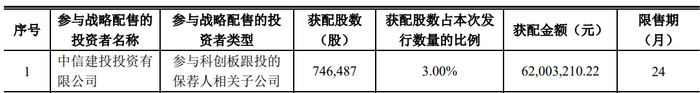 中信建投证券股份有限公司的子公司中信建投投资有限公司参与昂瑞微的战略配售,获配股数746,487股,占本次发行数量的3.00%,获配金额为62,003,210.22元。