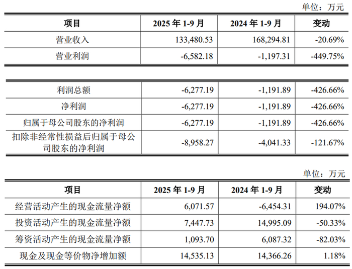 2025年1-9月,公司营业收入为133,480.53万元,同比变动-20.69%;净利润/归属于母公司股东的净利润-6,277.19万元,同比变动-426.66%;扣除非经常性损益后归属于母公司股东的净利润-8,958.27万元,同比变动-121.67%;经营活动产生的现金流量净额为6,071.57万元,同比变动194.07%。