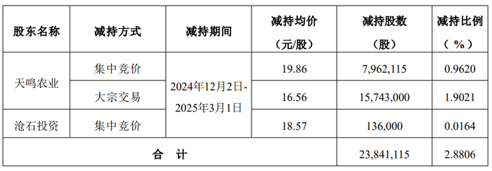 立华股份2025年3月3日披露《关于公司实际控制人之一致行动人减持期限届满的公告》显示,公司实际控制人程立力之一致行动人常州市天鸣农业技术服务中心(有限合伙)(简称天鸣农业)、深圳市沧石投资合伙企业(有限合伙)(简称沧石投资)通过集中竞价和大宗交易方式,合计减持公司2384.11万股,占公司总股本的2.8806%,套现金额约合4.21亿元。