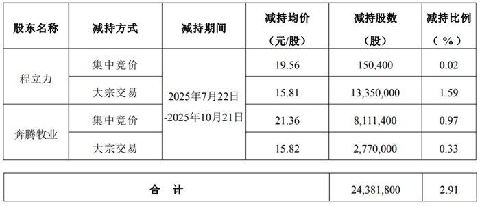 立华股份2025年10月22日披露《关于公司实际控制人及其一致行动人减持期限届满的公告》显示,公司实际控制人程立力通过集中竞价交易方式减持150,400股,减持均价19.56元;通过大宗交易方式减持13,350,000股,减持均价15.81元。其一致行动人常州市奔腾牧业技术服务中心(有限合伙)(简称“奔腾牧业”)通过集中竞价交易方式减持8,111,400股,减持均价21.36元;通过大宗交易方式减持2,770,000股,减持均价15.82元。上述股东合计减持24,381,800股,根据减持期间股价均价计算,套现总金额约为431,086,228元。