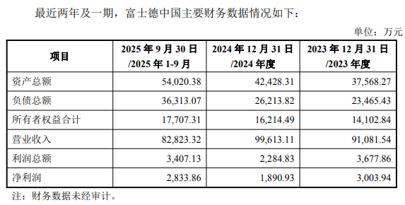 2023年度、2024年度、2025年1-9月,富士德中国营业收入分别为91,081.54万元、99,613.11万元、82,823.32万元,净利润分别为3,003.94万元、1,890.93万元、2,833.86万元。