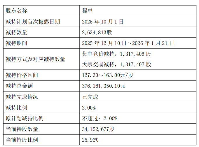 公司于2026年1月21日收到控股股东、实际控制人、董事长程卓出具的《关于减持股份结果的告知函》,2025年12月10日至2026年1月21日,在本次减持计划实施期间,程卓通过集中竞价及大宗交易方式累计减持公司股份2,634,813股,占公司总股本的2.00%。减持价格区间127.30至163.00元/股,减持总金额376,161,350.10元。本次减持计划已实施完毕。