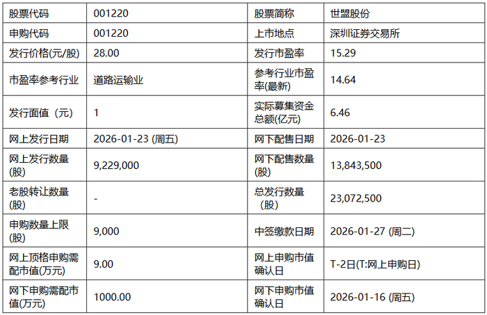 世盟股份2026年1月22日披露的上市发行公告显示,按本次发行价格28.00元/股和23,072,500股的新股发行数量计算,若本次发行成功,预计公司募集资金总额为64,603.00万元,扣除发行费用8,798.74万元(不含增值税)后,预计募集资金净额为55,804.26万元。